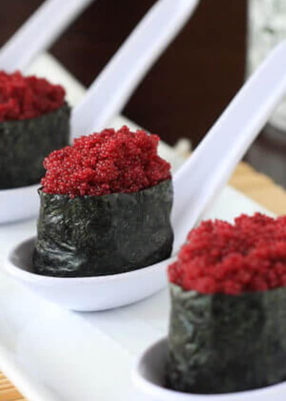 This recipe uses cooked amaranth to replicate the taste and feel of flying fish roe (also known as tobiko). The rich color is achieved by boiling and soaking the amaranth in a beet base.