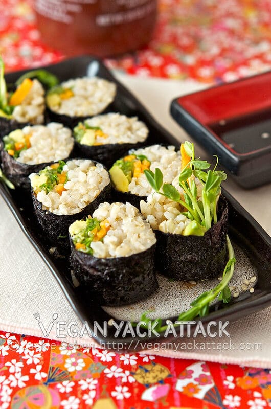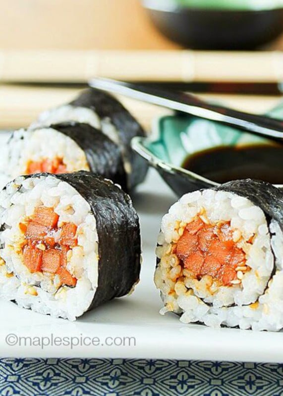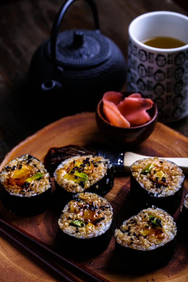 Stuffed with crisp sweet potato, avocado, and seasoned rice, these maki-style vegan sushi rolls are to die for. The recipe includes a homemade teriyaki glaze that you will want to smother on everything.