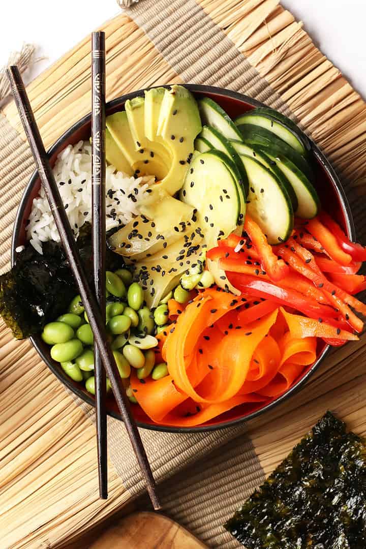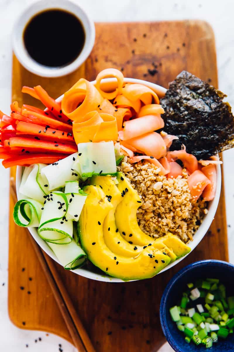 This vegan sushi bowl comes together easily once you have the components prepared! All you need is cooked rice, pickled vegetables, and sesame soy sauce.