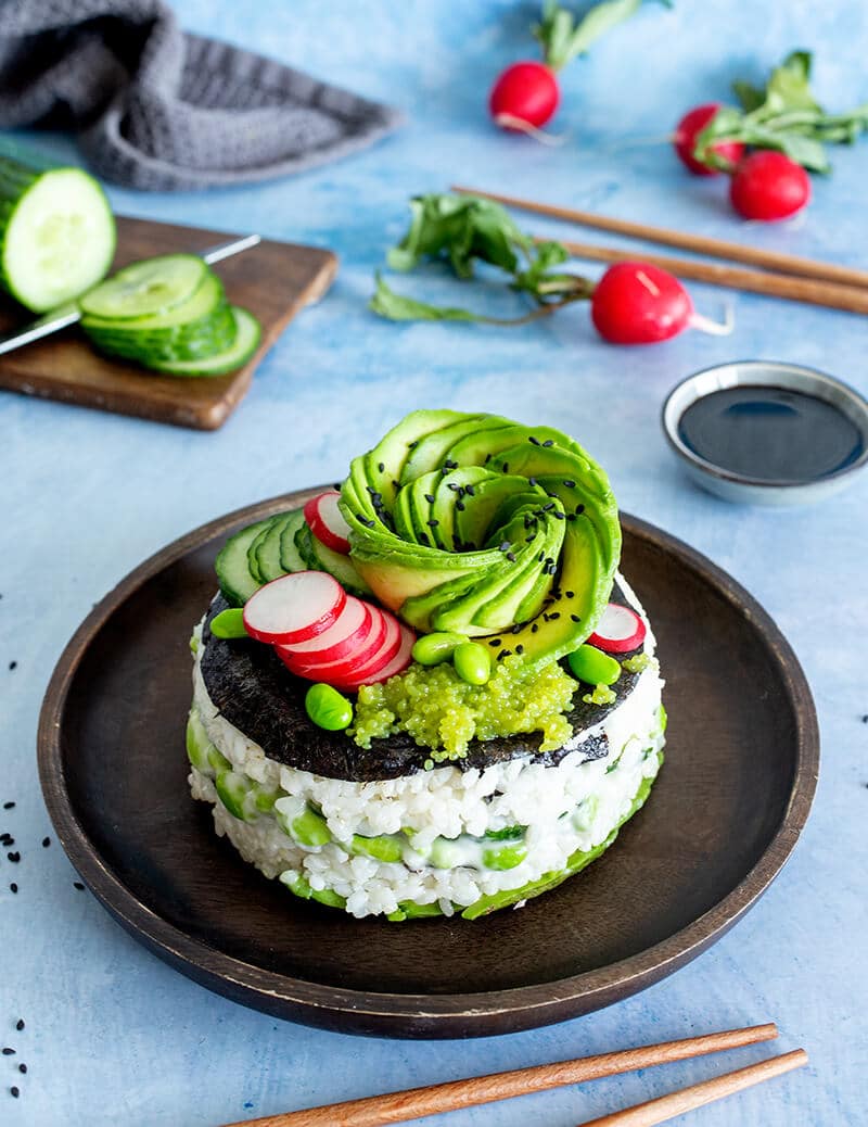 I had never heard of a sushi cake before, so of course we needed to include it! Quicker and easier than traditional sushi rolls, this cake is made with vegan caviar, coconut sugar, and vegan mayo.