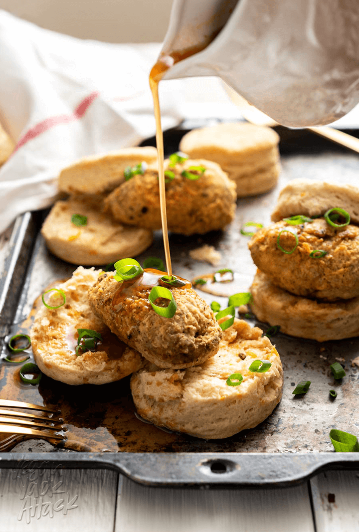 While not exactly a sandwich, this hearty and flavorful plant-based chicken-and-biscuits recipe is comfort food at its best.