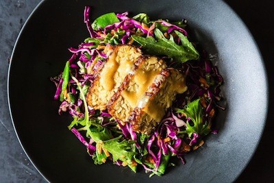 11. Snow Pea, Cabbage, and Mizuna Salad With Marinated and Seared Tempeh