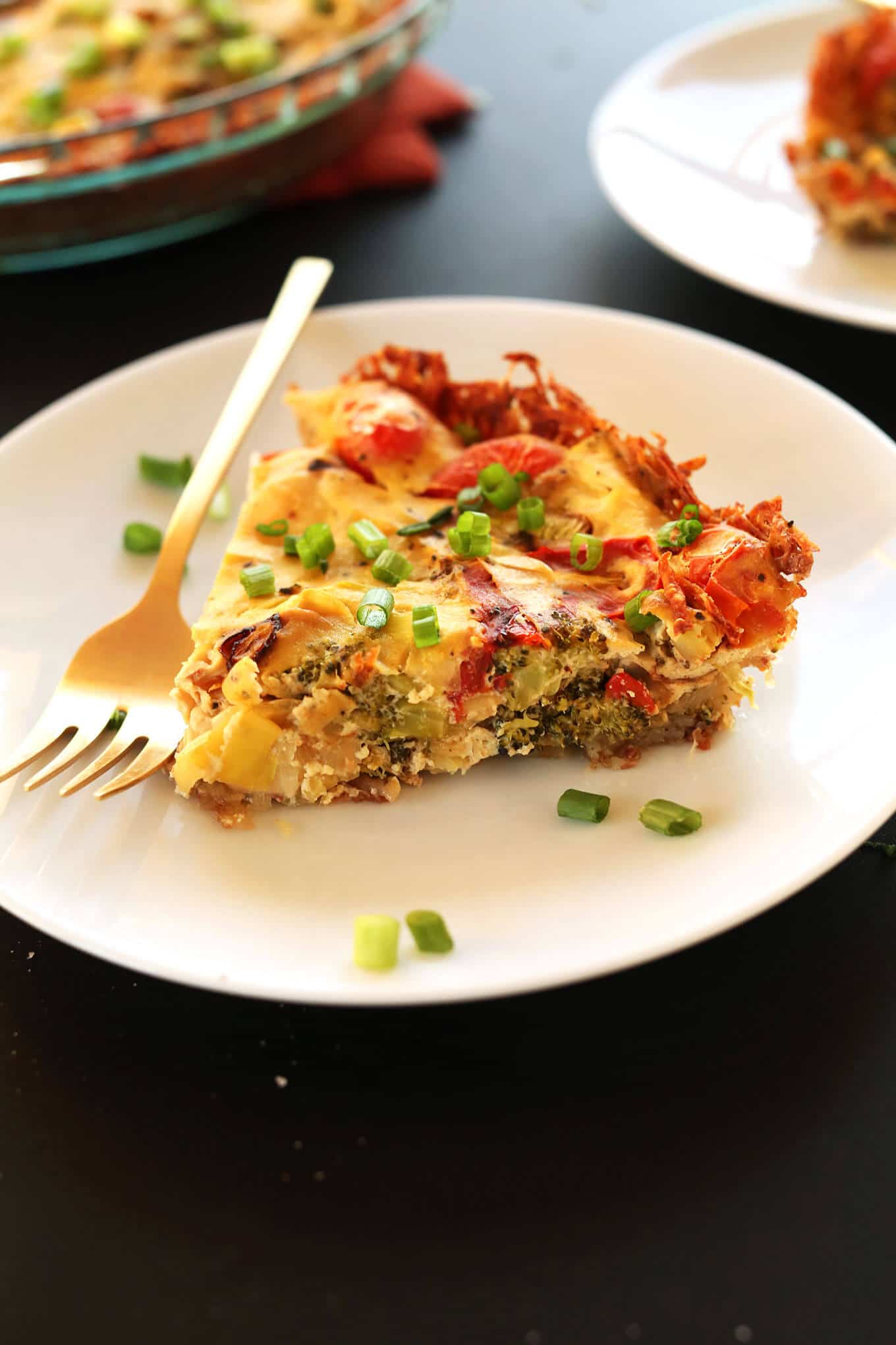 This tasty vegan quiche is easy to whip up and makes the perfect breakfast. Naturally gluten-free, the quiche boasts a hash-brown crust filled with roasted veggies, silken tofu, hummus, and nutritional yeast.