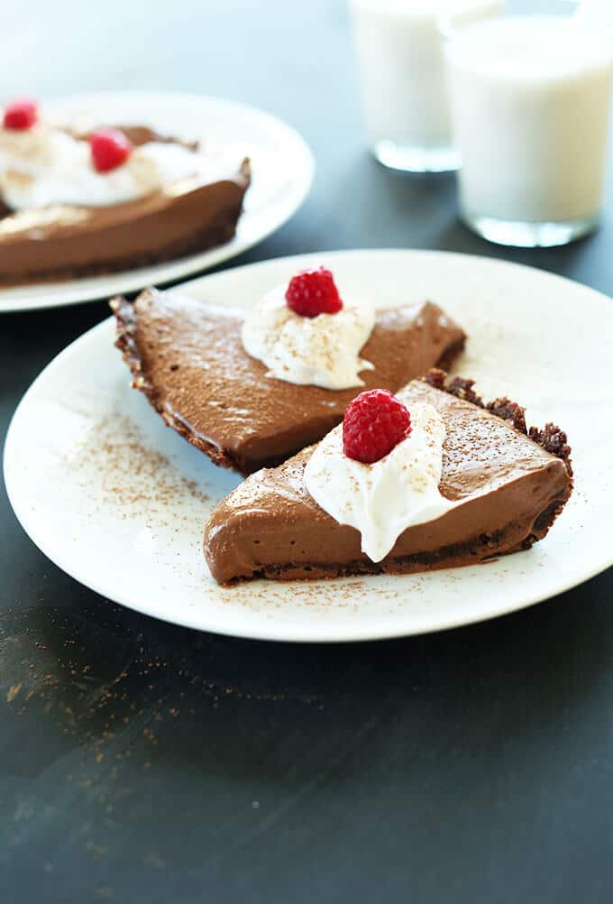 Surprise! Tofu is an excellent ingredient for pies! This simple chocolate silk pie has a raw brownie crust and is filled with a creamy, rich chocolate filling made from chocolate chips, silken tofu, and coconut milk.
