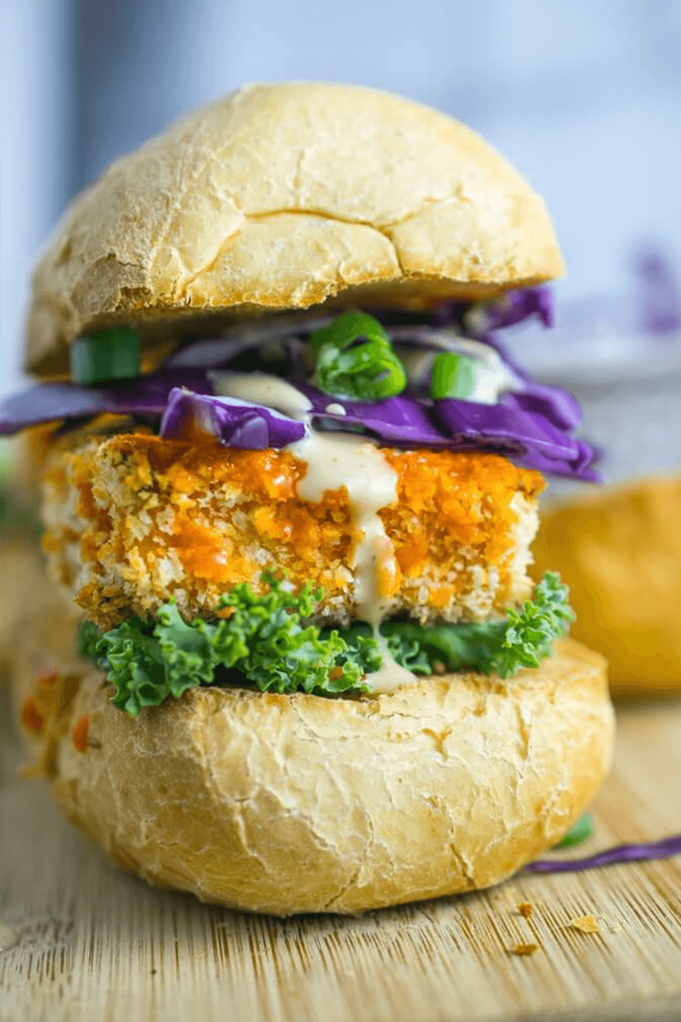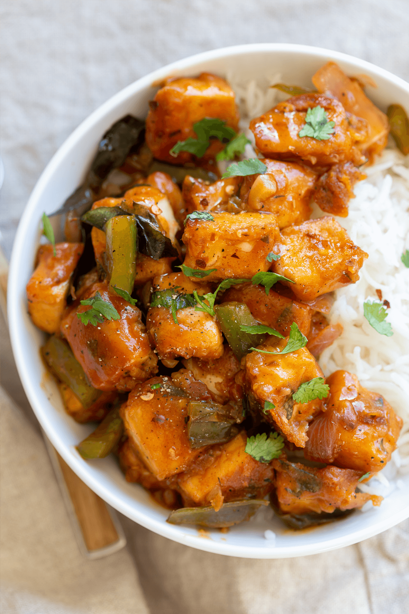 Served over rice or bread, this hearty vegan paneer takes tofu battered with spiced curry leaf and soy sauce and covers it with a tasty ginger, garlic, and Sriracha sauce.