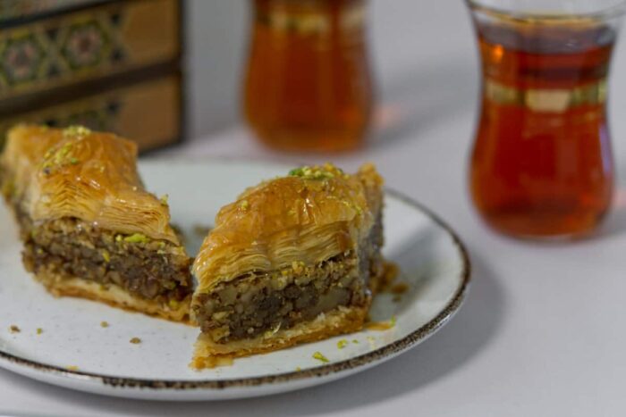 Similar to Greek baklava, Lebanese baklawa is a sweet, flaky pastry made with layers of phyllo dough, chopped nuts, and syrup flavored with rose and orange blossom water. This yummy dessert is often served with tea or coffee.