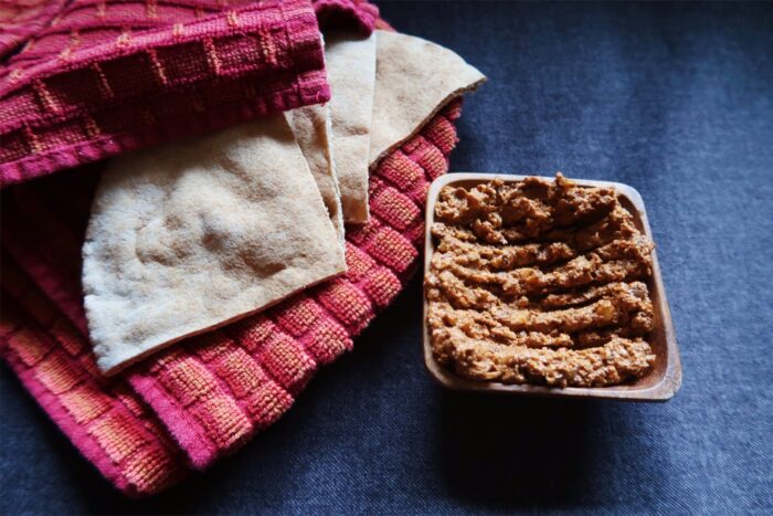 Muhammara is a popular dip that originated in Syria. It’s made with roasted red peppers, walnuts, breadcrumbs, olive oil, pomegranate molasses, garlic, and a blend of spices, such as cumin and Aleppo pepper. It can be served as a dip for pita bread or raw vegetables or used as a spread on sandwiches or crackers. The sweetness of the pomegranate molasses and the nutty flavor of the walnuts combine with the smoky roasted red peppers to create a complex and delicious flavor.