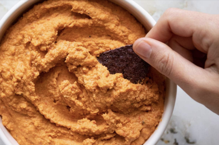 Hummus is a classic dip made with chickpeas, tahini, olive oil, lemon juice, and garlic. In fact, it’s every new vegan’s rite of passage to put hummus on just about everything! Hummus is often served as an appetizer or a snack with pita or vegetables but works great as a spread for sandwiches too. There are tons of variations. This recipe uses roasted red peppers to give the hummus an extra kick.