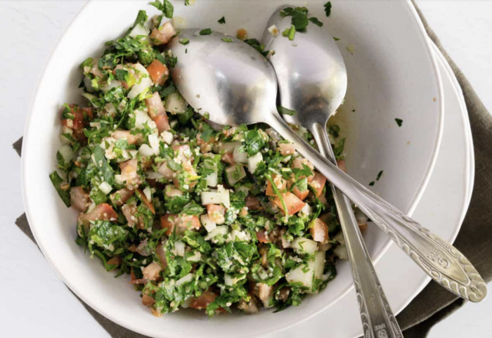 Tabouli is a popular salad made with parsley, tomatoes, onions, and bulgur wheat dressed with lemon juice and olive oil.