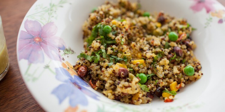 This delicious, colorful dish mixes tri-color quinoa with peanuts or cashews. All ingredients are easily accessible, and most can be stored for long periods.