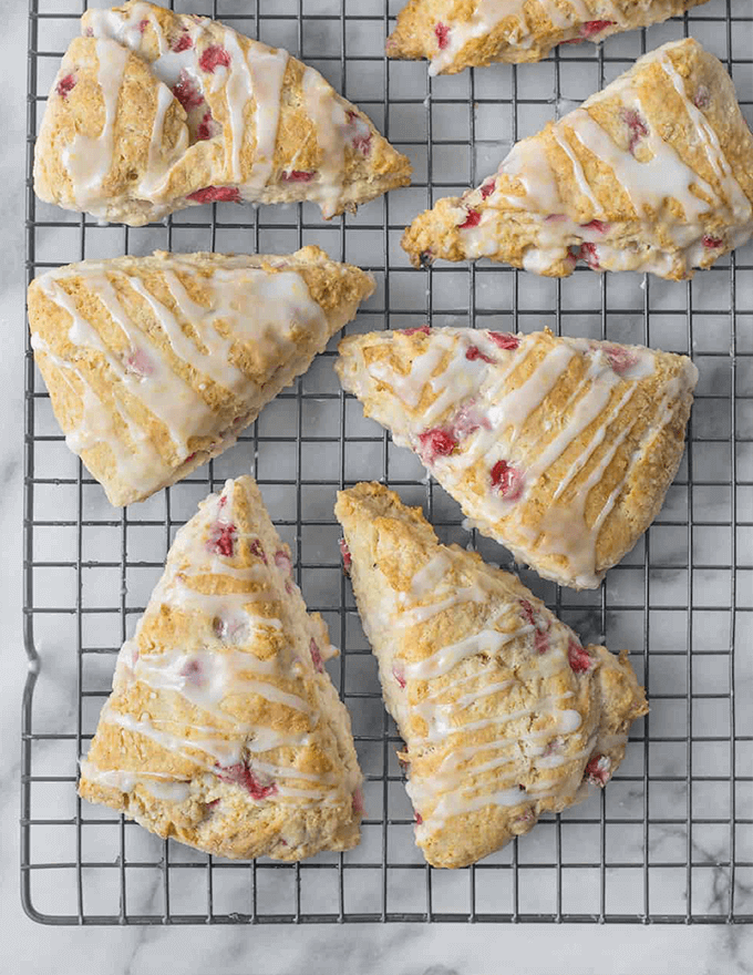 These tender scones are packed with strawberries and topped with a mouthwatering lemonade drizzle. The scones will keep for two or three days, but they can also be frozen and enjoyed whenever your next craving strikes.