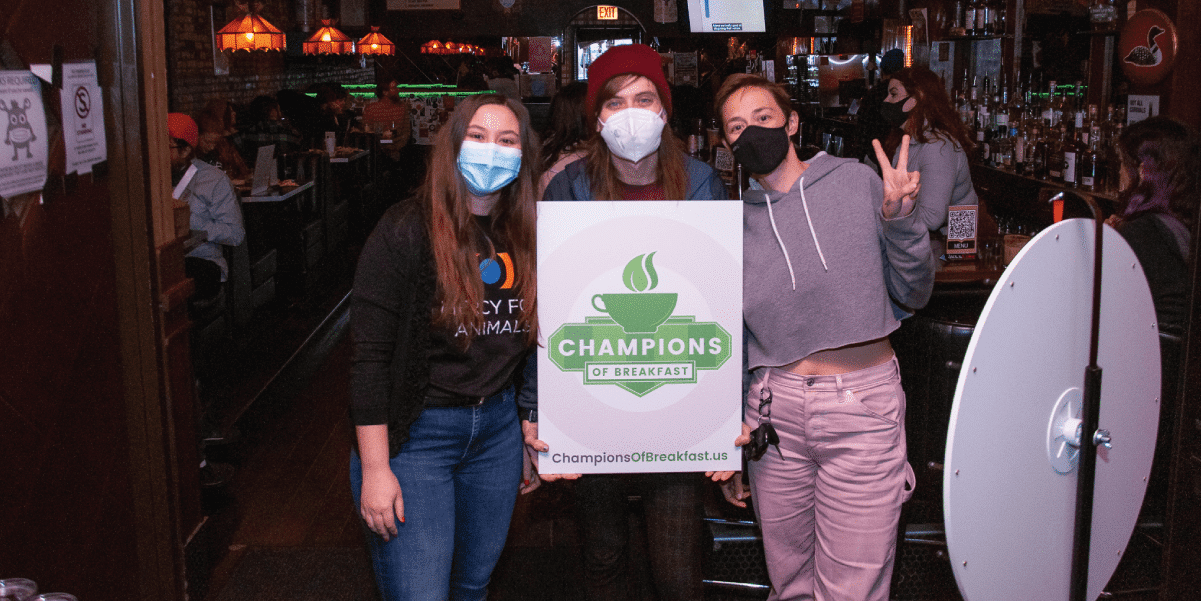 Mercy For Animals partnered with local vegan bar The Native to host an epic Champions of Breakfast event. Champions of Breakfast is our campaign to convince major restaurant chains to add vegan breakfast items to their menus. Attendees started off by spinning the plant-based prize wheel to win goodies from our friends at Hooray Foods, Hungry Planet, Zero Egg, Abbot’s Butcher, and Miyoko’s Creamery. In total, we distributed nearly 100 prizes throughout the day.