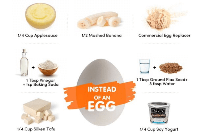 Countless egg replacers can be found at practically any grocer, including whole foods like chia seeds, flax meal, banana, and applesauce, as well as branded products like Ener-G Egg Replacer or Bob’s Red Mill Egg Replacer.