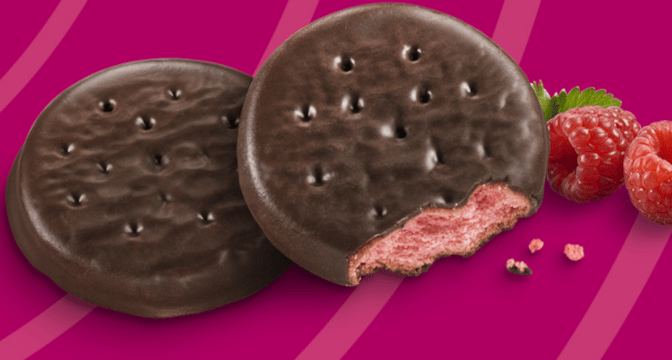 Rally the troops for this brand-new thin and crispy raspberry cookie coated in chocolate!