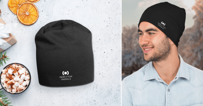Mercy For Animals’ light-weight jersey logo beanie is sure to keep your head and heart warm. Thanks to its breathable lightweight fabric, you can wear it both indoors and outdoors.