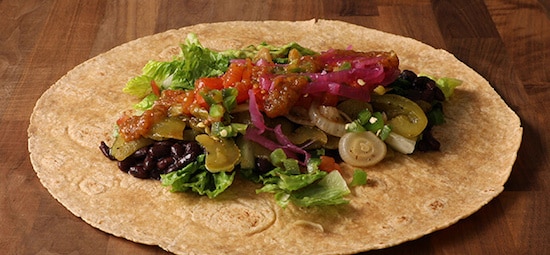 A whole-grain tortilla is stuffed with romaine, black beans, pico de gallo, guacamole, pickled red onions, jalapeños, grilled onions, and peppers.