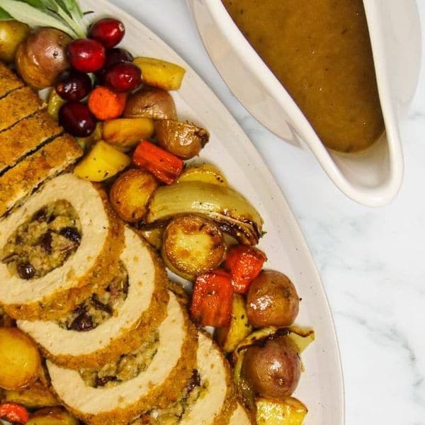 Gardein is well known for its incredible vegan meats, and its turk’y roast lives up to the company’s reputation. Filled with mouthwatering cranberry-wild-rice stuffing, this roast serves eight and includes homestyle gravy!