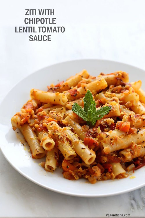 4. Ziti With Chipotle Lentil Tomato Sauce