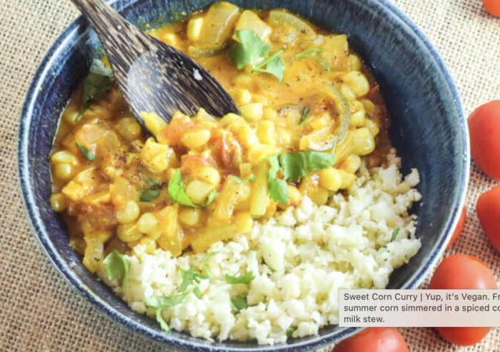This unique curry dish has plump kernels of sweet corn in every warm, comforting bite. Pair the curry with cauliflower rice for a veggie-packed, satisfying meal.