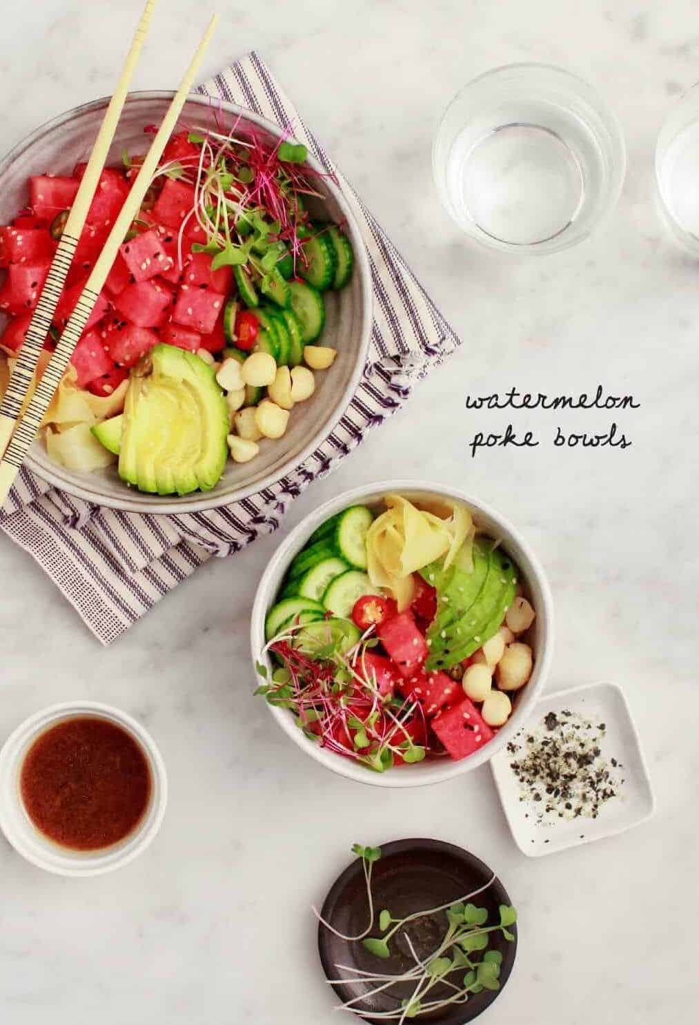 Originating in Hawaii, poke bowls are “deconstructed sushi” bowls that often consist of rice, raw fish, and toppings like green onions and sesame seeds. This creative poke bowl recipe uses watermelon for a sweet, refreshing take on fish.
