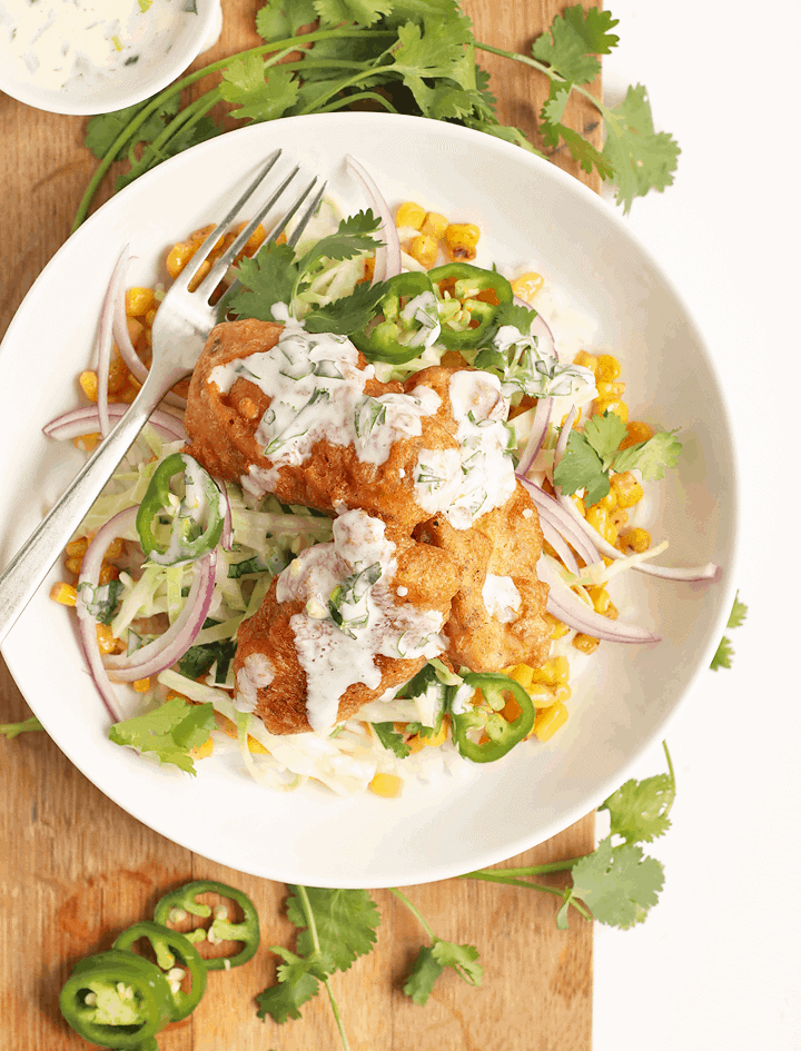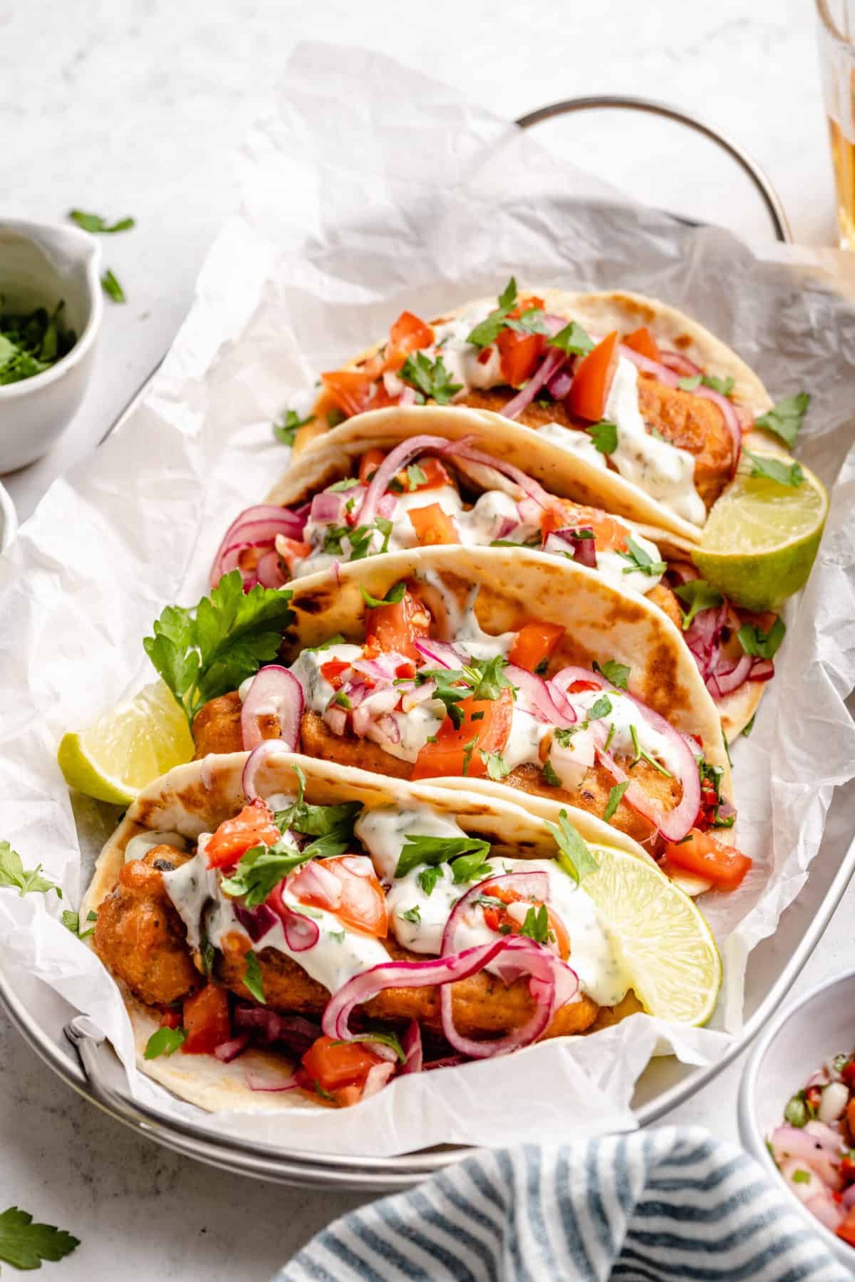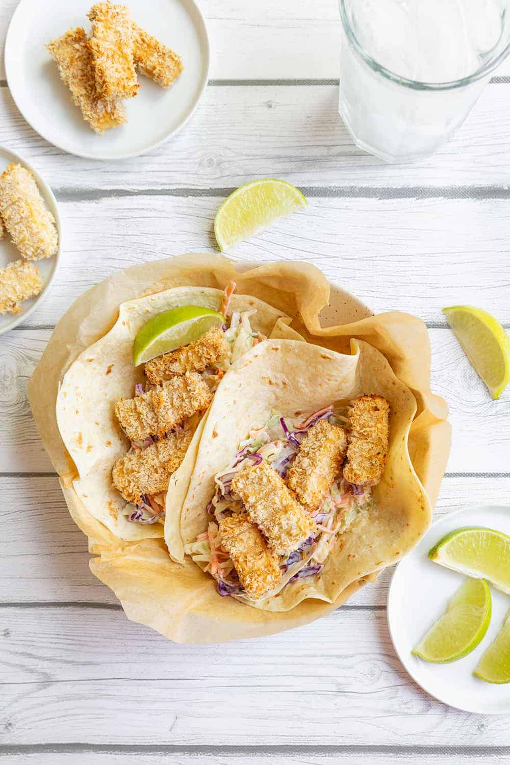 Anyone for more fish tacos? Make sure to top these succulent tacos with pico de gallo, pickled veggies, and vegan tartar sauce—and don’t forget the squeeze of fresh lime juice on top!