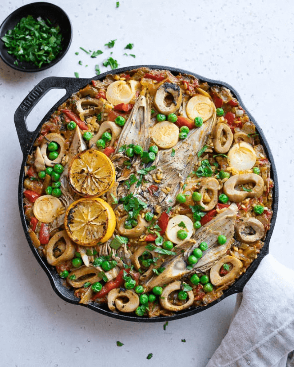 Let us wrap up our recipe roundup of vegan fish with a decadent plant-based seafood paella! Don’t be afraid—this exciting recipe is nowhere near as intimidating as it looks.