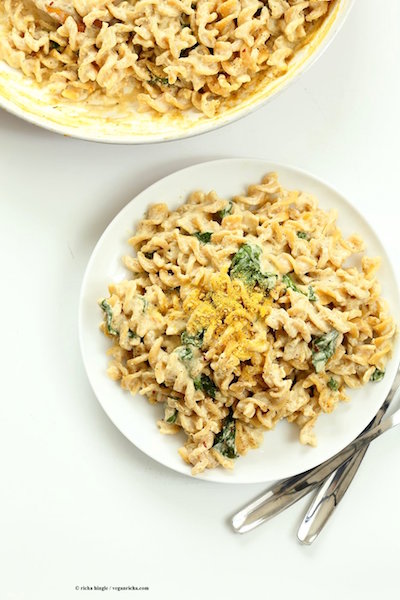 Nutritional yeast is an inactive yeast that’s grown on a nutrient-dense medium and then harvested and dried. A serving of nooch (two tablespoons) contains all nine essential amino acids and nine grams of “complete” protein. When fortified, it is also a great source of iron and B vitamins. Known for its cheesy, nutty flavor, nutritional yeast can be found at most natural food stores and the bulk bin at some nationwide grocers like Whole Foods. While you can certainly just sprinkle them on popcorn, these savory flakes can take your favorite recipes to the next level.