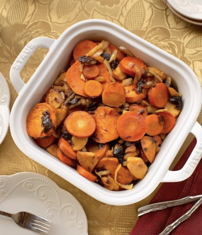 Tzimmes (or tsimmes) is a traditional stew often served as part of a Passover or Rosh Hashanah meal. While there are tons of variations, the base ingredients are carrots or other root vegetables, such as sweet potatoes, and dried fruit. Since most of the typical ingredients are already plant-based, veganizing this comforting dish is easy.
